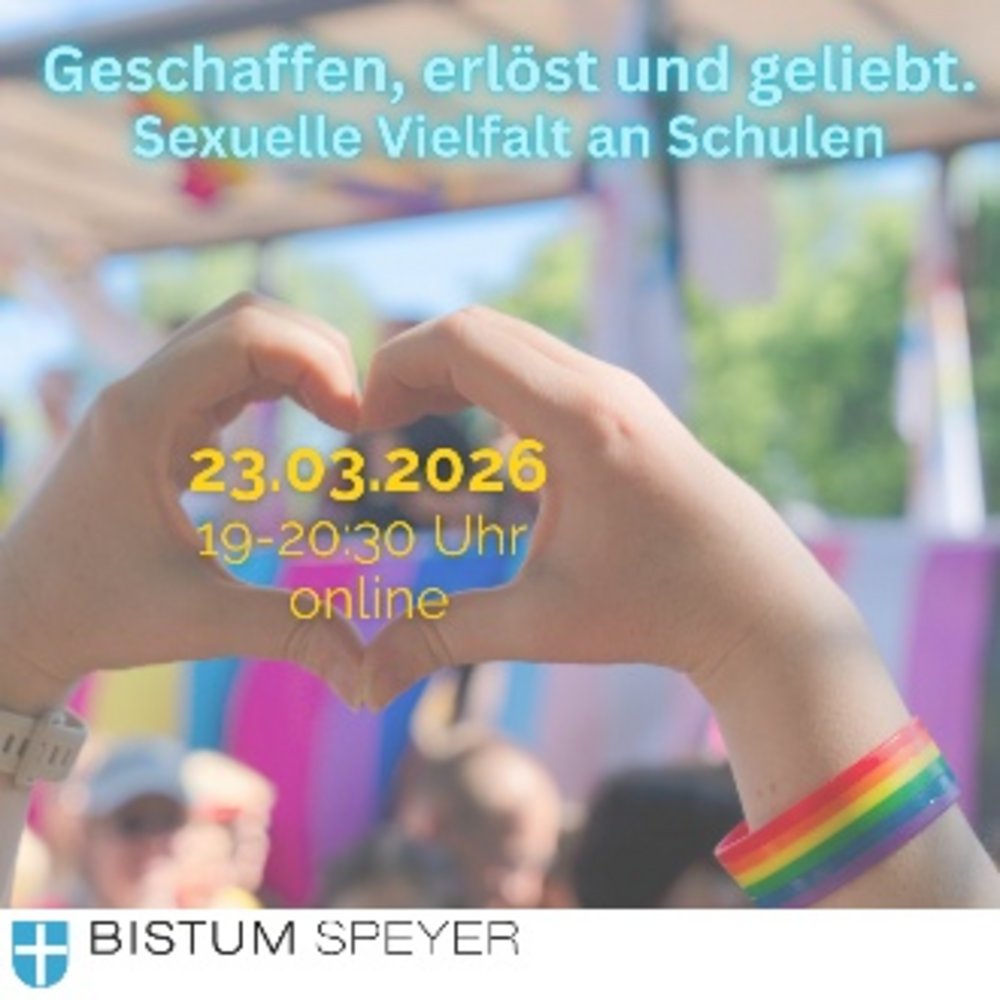 Zum Thema "Sichtbarkeit und Anerkennung der Vielfalt sexueller Identitäten in der Schule" haben die Deutschen Bischöfe am 01. Oktober 2025 ein Schreiben unter dem Titel "Geschaffen, erlöst und geliebt" verfasst. Vor diesem Hintergrund findet am Montag, den 23. März 2026, von 19:00 bis 20:30 Uhr eine Online-Informationsveranstaltung statt, in der Eltern, Schüler*innen und Interessierte eingeladen sind, über ihrer Erfahrungen, Wünsche und Fragen ins Gespräch mit Ansprechpartner*innen des Bistums Speyer zu kommen.